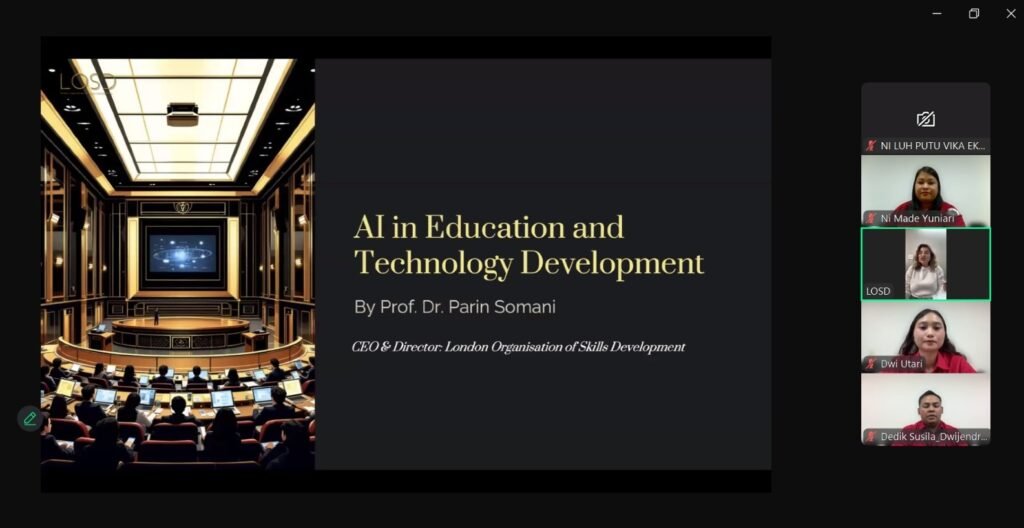 Kuliah tamu ini menghadirkan narasumber internasional, Prof. Dr. Parin Somani, CEO dan Director London Organisation of Skills Development (LOSD). Dalam paparannya, Prof. Parin Somani menekankan bahwa kecerdasan buatan (Artificial Intelligence/AI) kini telah menjadi bagian infrastruktur penting dalam dunia pendidikan dan bukan sekadar teknologi tambahan. Menurutnya, pesatnya digitalisasi, globalisasi pembelajaran, serta meningkatnya kompleksitas pengetahuan menuntut sistem pendidikan untuk beradaptasi secara cerdas dan berkelanjutan  .
